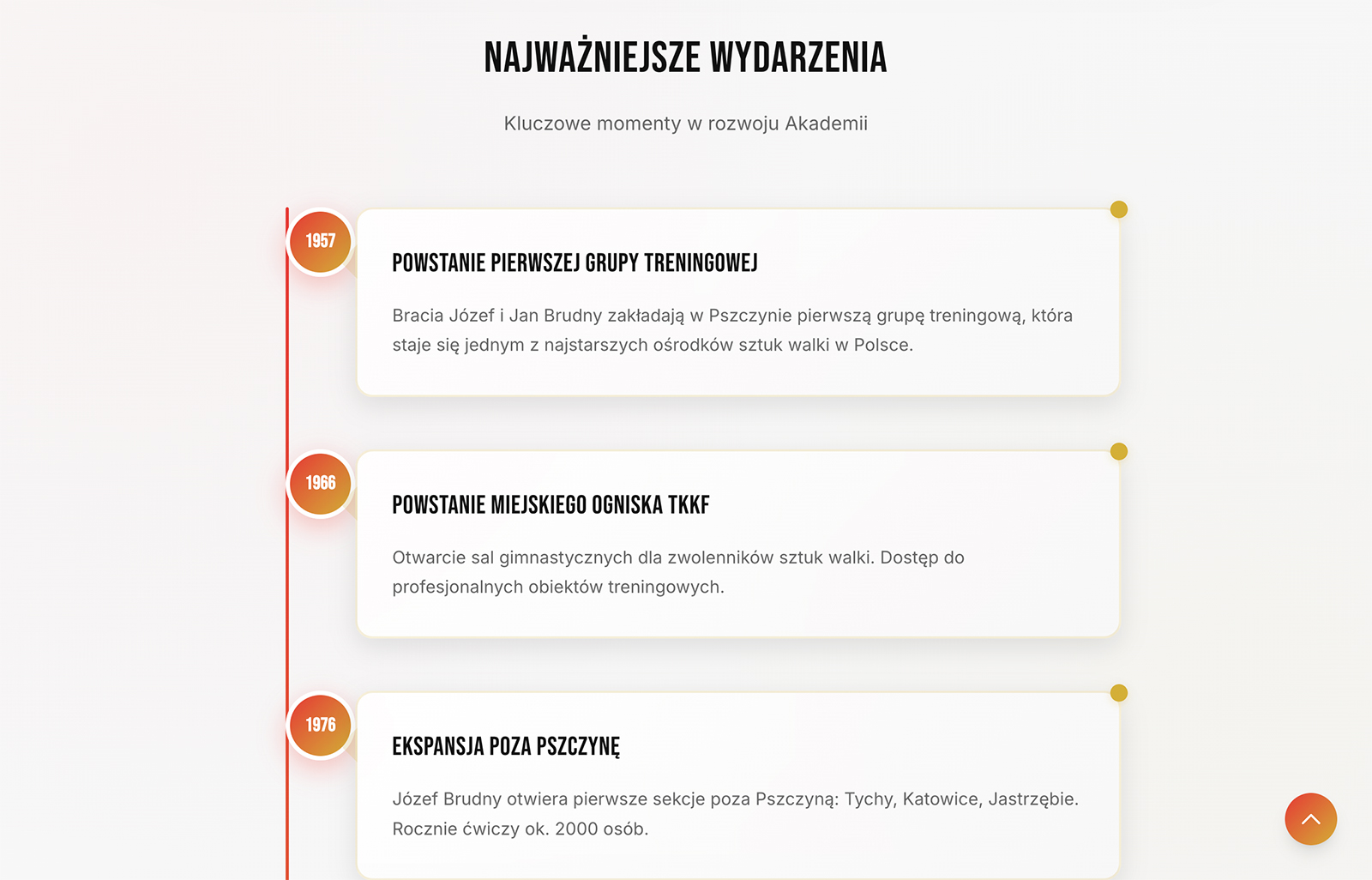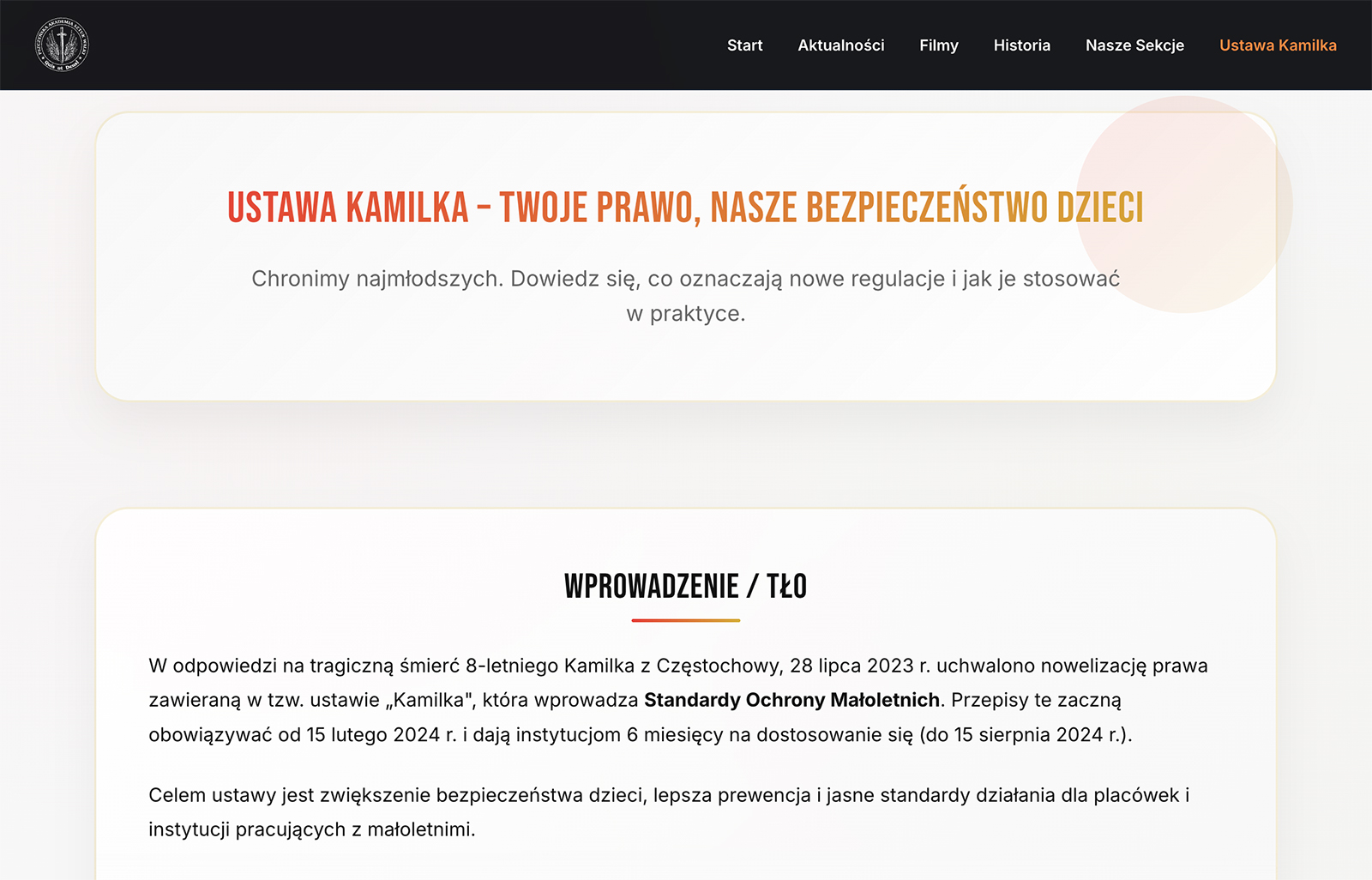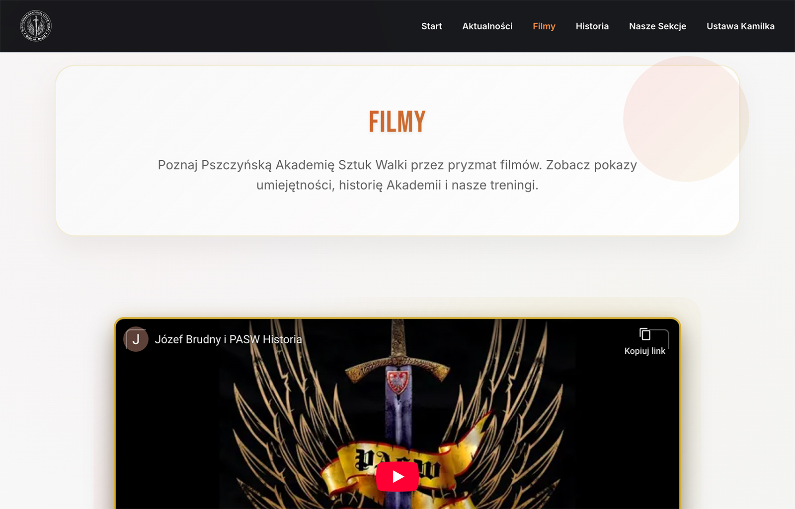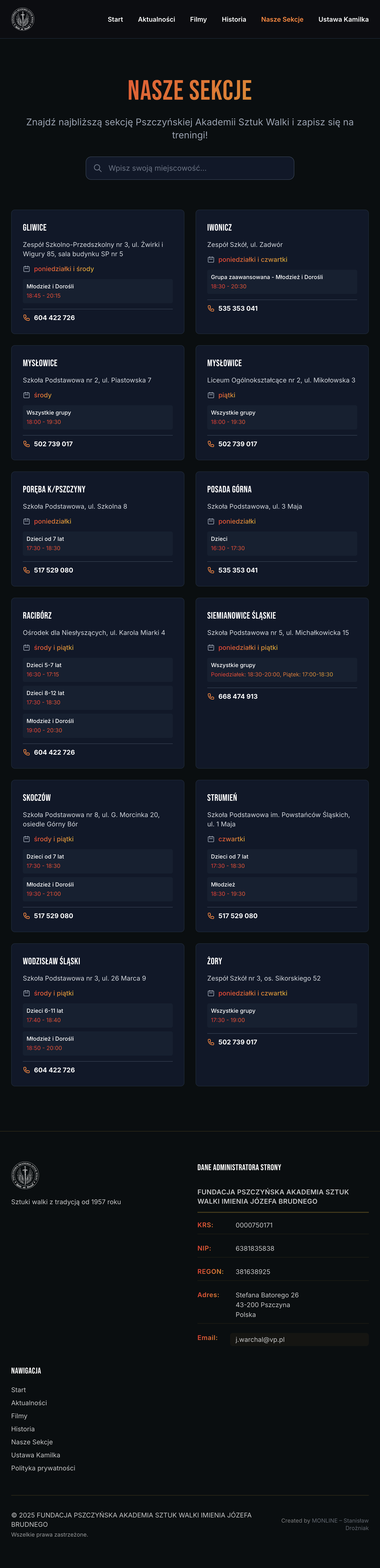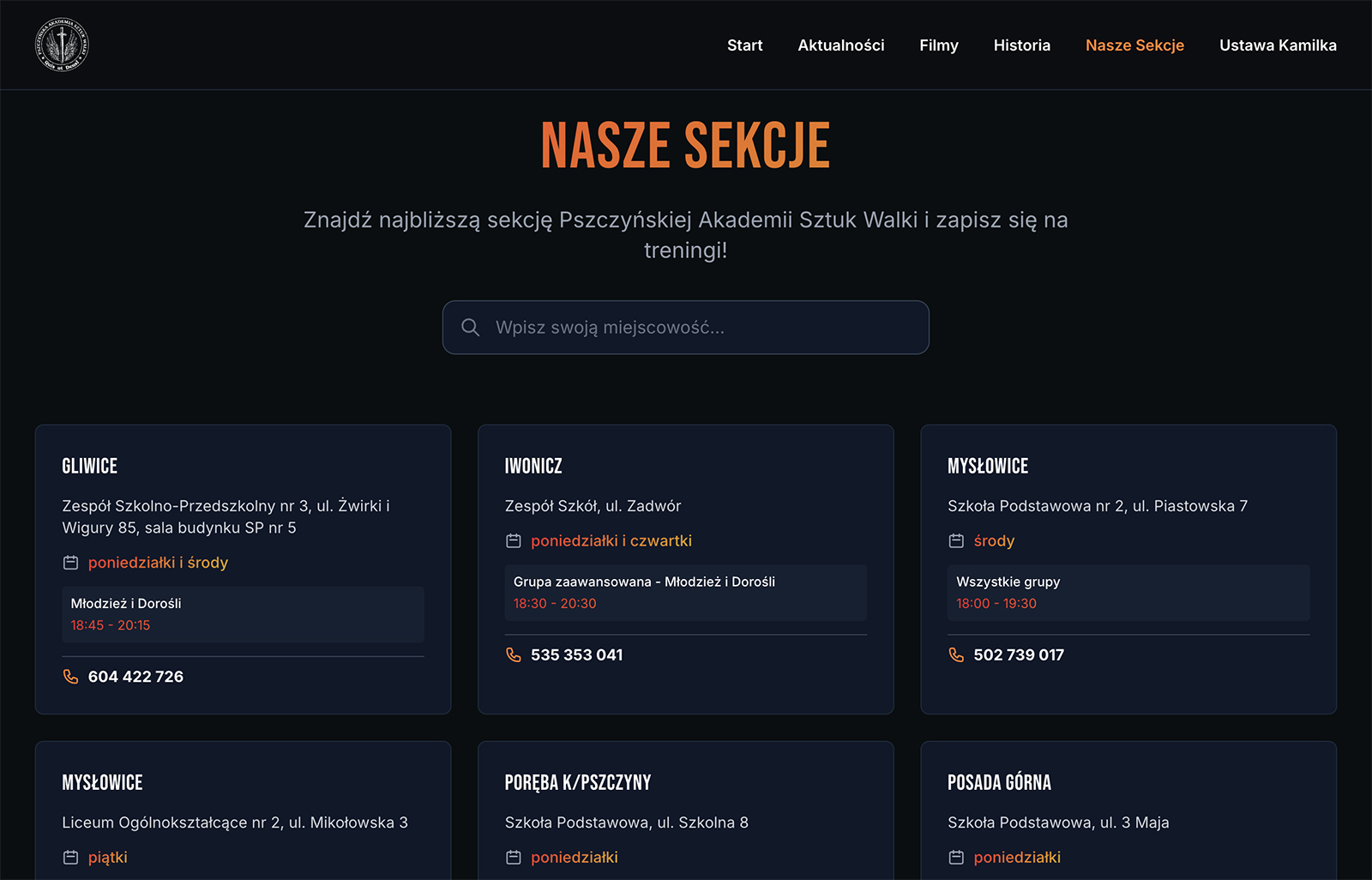 Celem projektu było stworzenie nowej strony, która działa szybko na urządzeniach mobilnych, w przejrzysty sposób pokazuje sekcje i grafik treningów oraz lepiej prezentuje historię akademii.